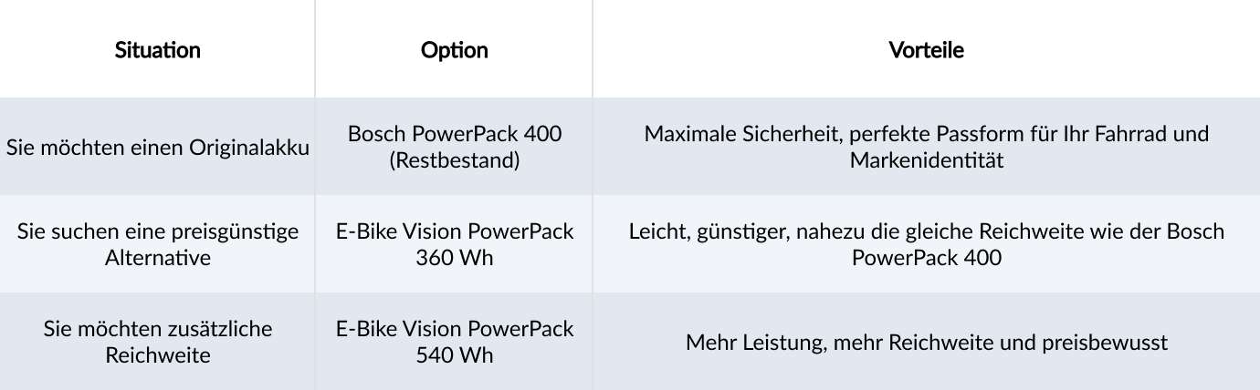 E-Bike-Besitzer mit einem Bosch PowerPack 400 Akku stehen seit Kurzem vor einer neuen Herausforderung: Bosch hat die Produktion dieses beliebten Akkus eingestellt. Aber was nun? Muss man unbedingt einen originalen Bosch-Akku suchen, oder gibt es eine gute Alternative? In diesem Artikel stellen wir die Unterschiede dar und zeigen, welche Rolle die Akkus von E-Bike Vision dabei spielen.