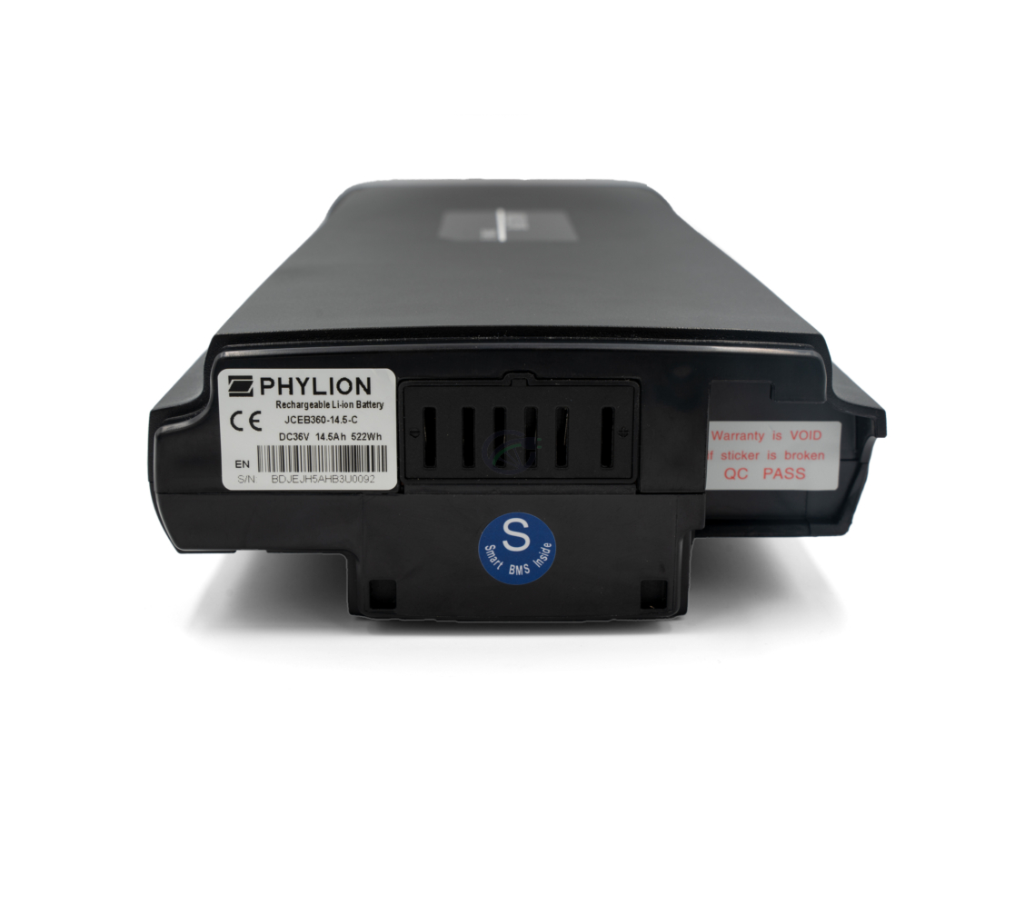 Der Joycube SF-03 Phylion Akku 36V 11Ah JCEB360-11 ist rechteckig und sollte am Gepäckträger in das System eingeklickt werden. Was besondere Aufmerksamkeit erfordert und was den Fahrrad Akku auszeichnet, ist seine Konstruktion. Die Phylion SF-03 Serie ist der Phylion Wall-ES Serie sehr ähnlich, aber sie sind nicht identisch (siehe Bild oben). Der Phylion SF-03 Joycube JCEB360-11 Akku 36V 11Ah hat eine LED-Akkuanzeige und der Fahrrad Akku sollte mit einem 5-poligen Ladegerät geladen werden. Schließlich ist dieser Fahrradakku Plug & Play.